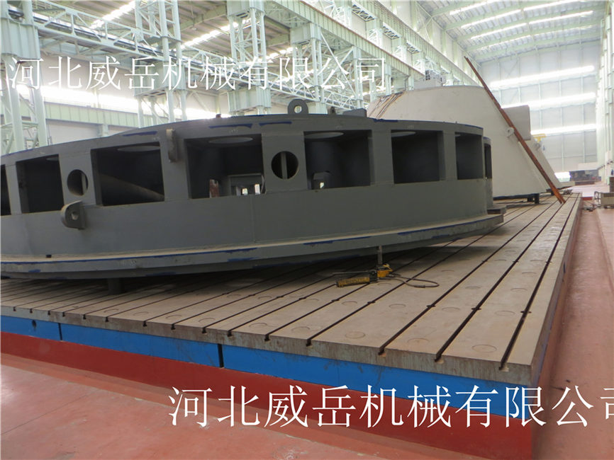 铸铁T型槽平台是铸铁T型槽平板的另一种叫法,是用于工件、设备检测、划线、装配、焊接、组装、铆焊的平面基准量具。按用途分为铸铁检验平台、铸铁划线平台、铸铁装配平台、铸铁试验平台、铸铁基础平台等,外观基本上是箱体式,工作面有长方形、正方形或圆形,材料为铸铁HT200-300,球墨铸铁QT400-600。铸铁T型槽平台的工作面采用刮研工艺,工作面上可加工V型槽、T型槽、U型槽、燕尾槽、圆孔、长孔等。铸铁T型槽平台的精度:按计量检定规程JJG117-2005平板检定规程铸铁平台分为00级,0级,1级,2级,3级,精刨级。 为满足使用和验收的合格,铸铁T型槽平台按标准GB/T 22095-2008 制造。 工作面整体规格为 4米×8米,大于此规格可以多块拼接。铸铁平台单件重量可达80吨。